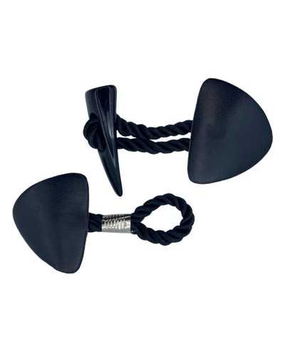 Produktbeschreibung: Klassischer Alamaro mit großen Abmessungen, aus Leder und Metall gefertigt, ideal als Verschluss für Mäntel und Pullover verschiedener Art und Materialien.
