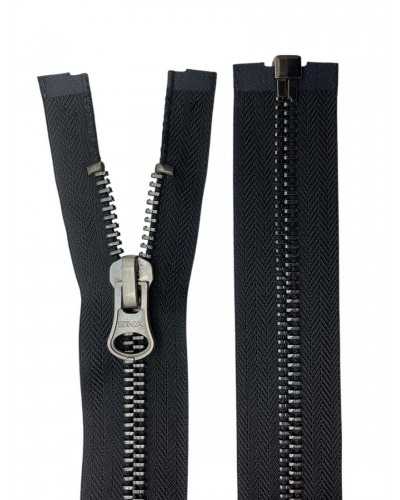 70 cm teilbarer Reißverschluss mit 8 mm Metallkette in Gunmetal-Ausführung. Schwarzes Polycotton-Gewebe, haltbar und nähbar. Ideal für Jacken, Taschen, Rucksäcke und technische Kleidung. Preis pro Stück.