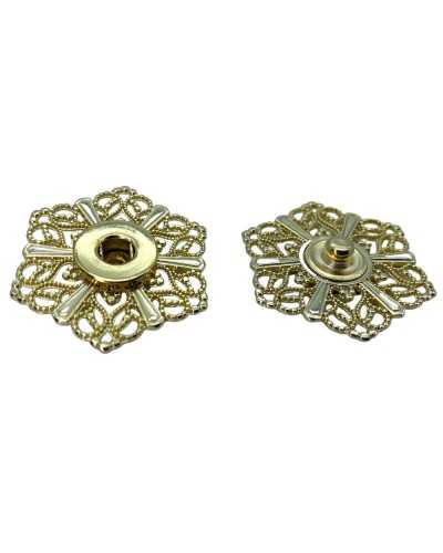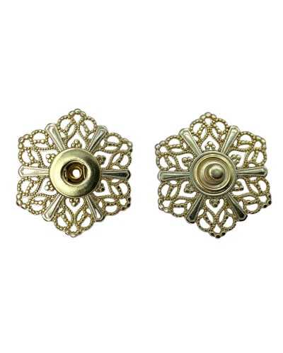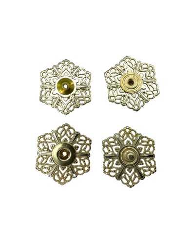 Automatic sewing button with press fastener made of zamak material filigree design hexagonal shape available in line 44 with smoke-gold-brass old-nickel finish.