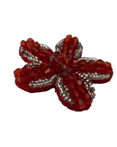 A sartorial appliqué with a refined design, perfect for formal wear, children's fashion, handmade accessories and craft decorations. Made on a textile base, each petal is embellished with faceted red beads and silver microbeads, hand-stitched with care and precision.