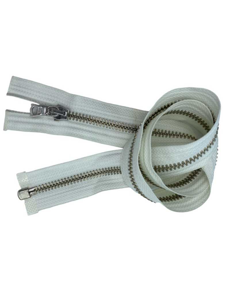 Cerniera lampo divisibile di alta qualità sartoriale, con nastro in tessuto bianco latte e catena in metallo argento misura 6. Ideale per giacche, cappotti, borse e accessori moda, questa zip è perfetta per progetti di cucito professionali e creativi.