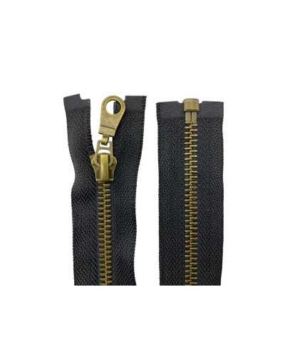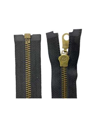 Cerniera divisibile da 70 cm con catena n.5 in metallo finitura oro vecchio brunito e 1 cursore. Fettuccia in policotone resistente. Ideale per giacche, borse, zaini e abbigliamento sartoriale. Prezzo per pezzo.