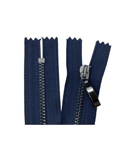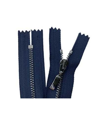Cerniera lampo fissa 18 cm, con catena 4 mm in metallo finitura oro, canna di fucile e 1 cursore in metallo. Il nastro in tessuto tecnico blu notte garantisce resistenza e flessibilità. Perfetta per giacche leggere, felpe, abbigliamento tecnico e accessori moda. Il colore scuro e metallico dona un tocco moderno e professionale.