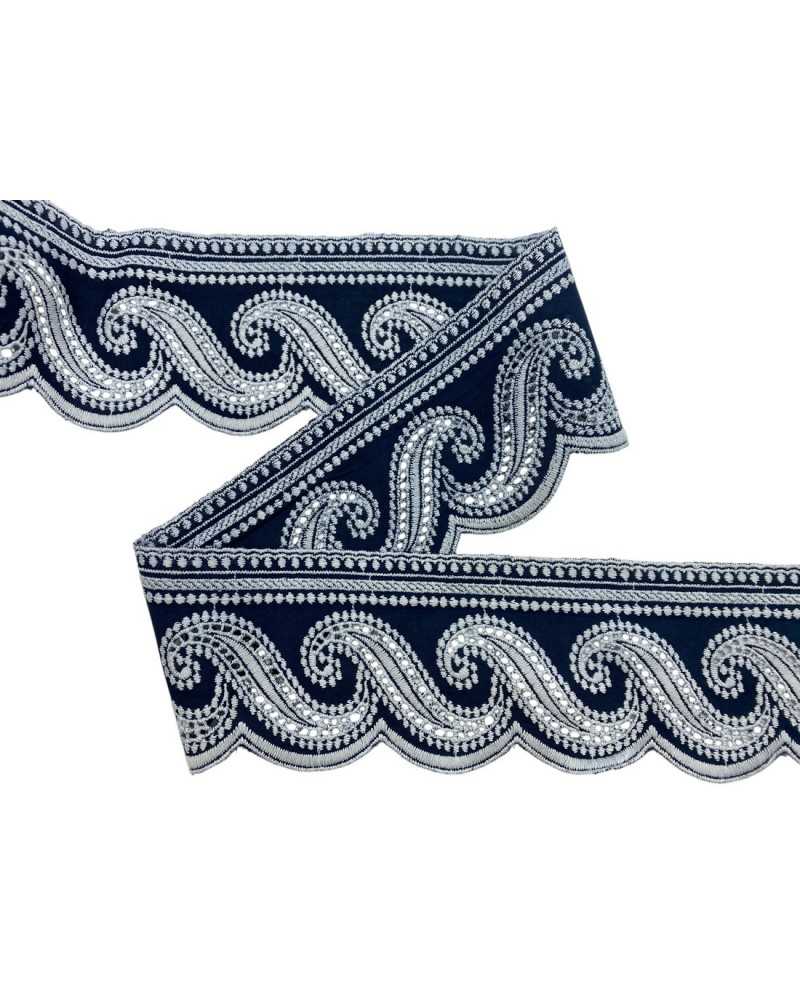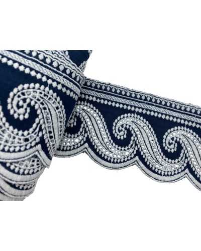 Passamaneria in cotone bianco ricamata stile Sangallo con elegante bordo blu all'uncinetto. Alta 8 cm, perfetta per decorare abiti e accessori. Tagli da 50 cm.