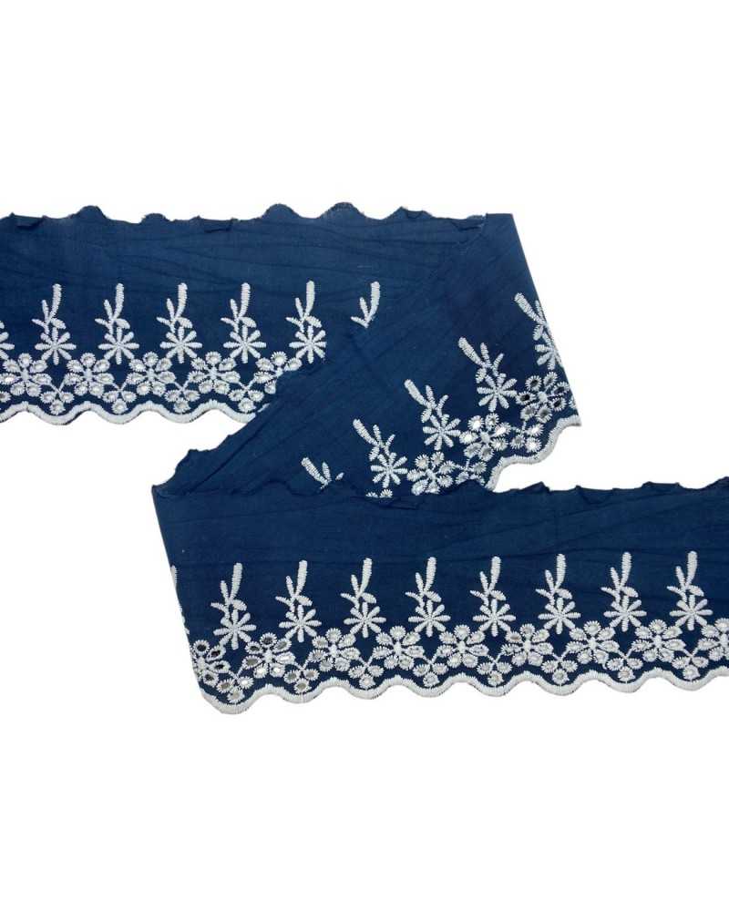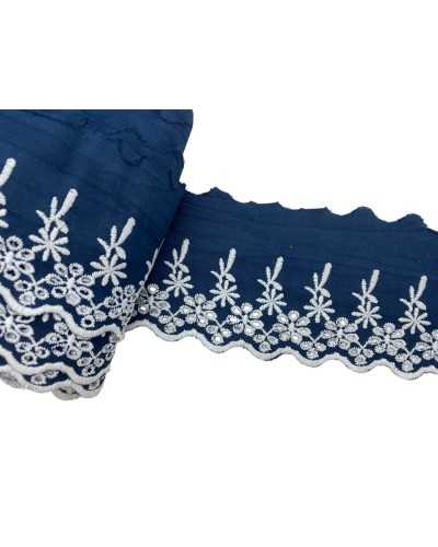 50 cm Passamaneria Pizzo Sangallo Ricamo Fiore Bianco con Bordo Blu Cotone Altezza 9 cm