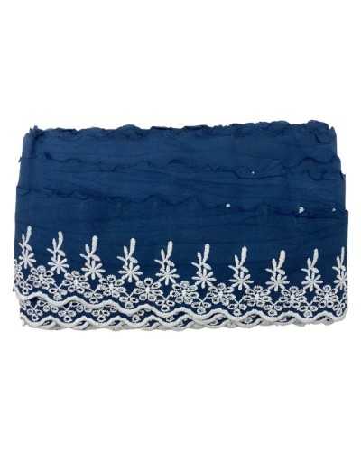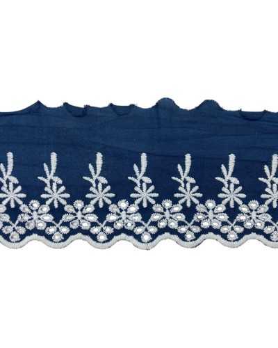 Passamaneria in cotone bianco ricamata stile Sangallo con elegante bordo blu all'uncinetto. Alta 9 cm, perfetta per decorare abiti e accessori. Tagli da 50 cm.