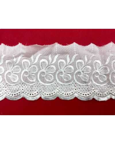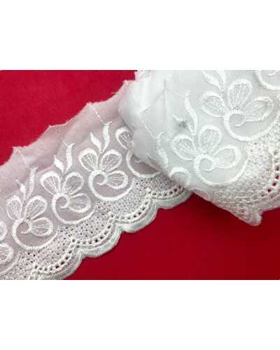 Pizzo Sangallo bianco in polycotone, altezza 7 cm. Motivo floreale traforato con bordo smerlato. Ideale per abiti, camicie, tende, accessori e decorazioni handmade. Venduto al metro con taglio continuo. Made in Italy.